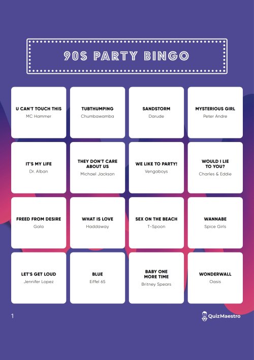 Können wir bitte ganz schnell in die 90er Jahre zurückkehren!? In diesem Musik-Bingo wirst du nur die besten Hits aus den 90ern hören! Früher war alles besser, oder? Genieße es, bei all den Klassikern mitzusingen! Erinnerst du dich an alle Lieder?